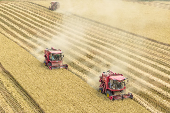 2025年6月9日,河南省三门峡灵宝市西阎乡东古驿村村民在抢收小麦(无人机照片)。新华社发(杜杰 摄)沃野良田,夏粮产量达2994.8亿斤,早稻增产6.8亿斤,秋粮播种面积稳中有增;