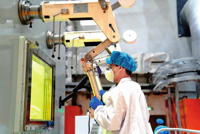 在中国科学院上海应用物理研究所武威园区,科研人员在2兆瓦液态燃料钍基熔盐实验堆加料-取样热室工作(2025年10月24日摄)。张建松摄/本刊