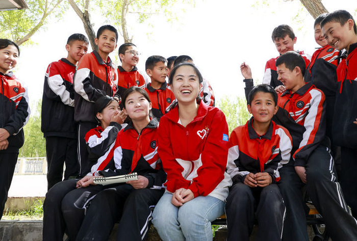 在新疆阿图什市哈拉峻乡谢依特小学,支教教师高淑贤和学生们在一起(2025年4月23日摄)。新华社记者 王菲 摄